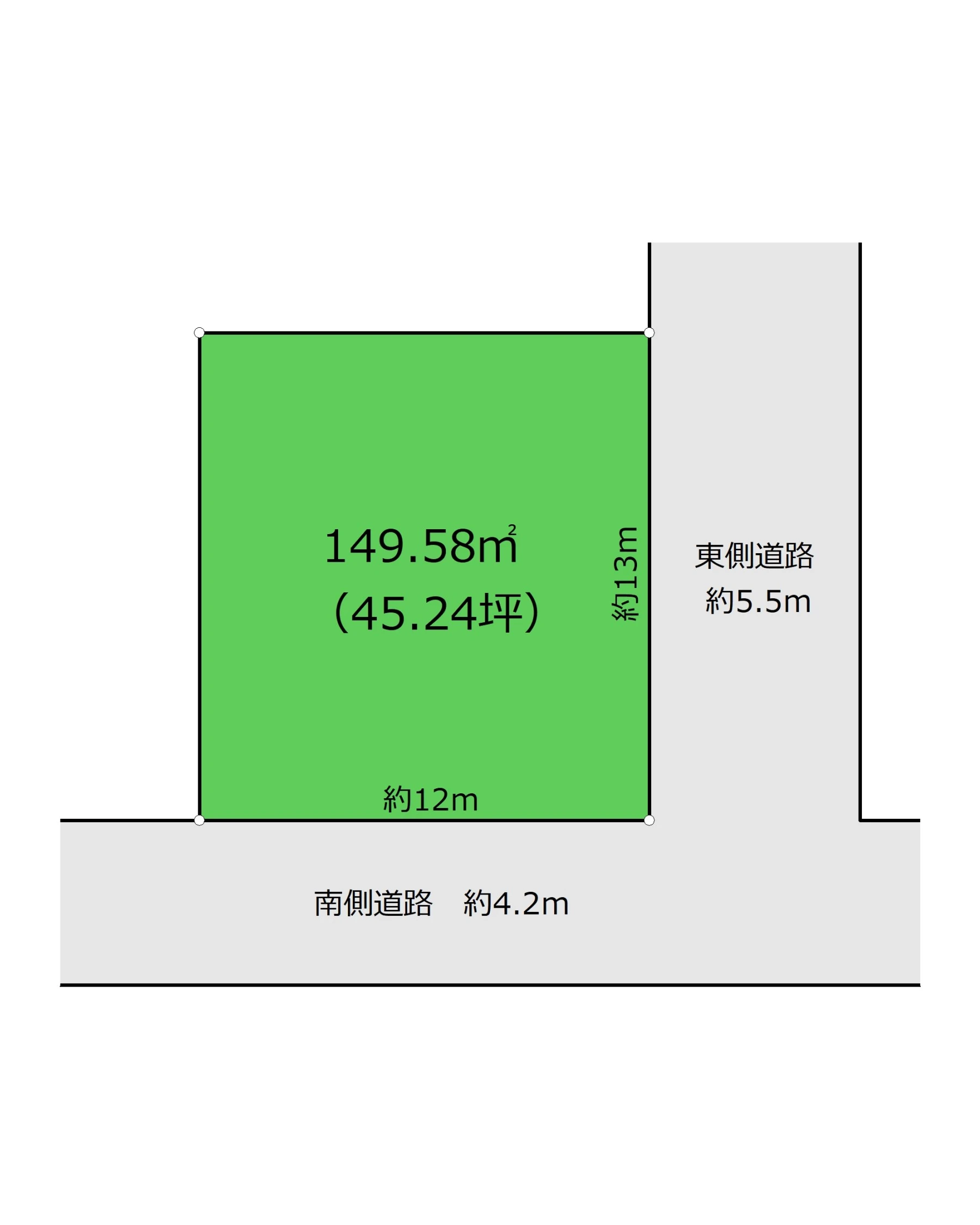 状況:角地 東側 幅員5.5m 公道に13m接面 南側 幅員4.2m 公道に12m接面